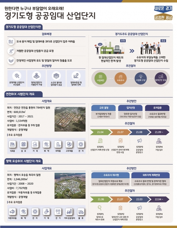 그간 도는 지난해 8월 이재명 지사가 “공공임대 주택처럼 저렴한 공공임대 산업용지를 공급해 달라”는 한 중소기업인의 제안을 받은 이후, 실무협의체를 구성해 사례검토, 수요조사 등 다양한 구체화 작업을 추진해왔다.