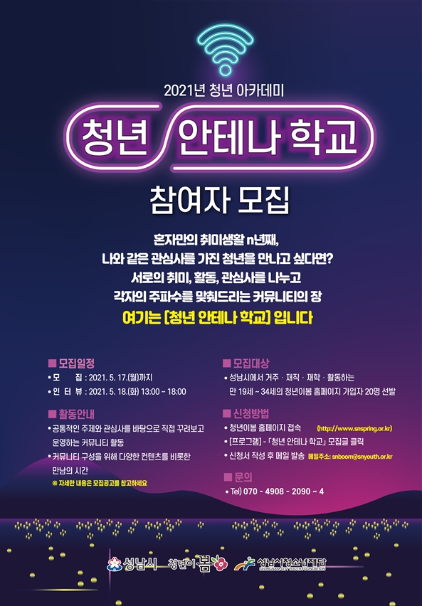성남시청년지원센터 ‘청년이봄’에서는 오는 17일까지 ‘청년 안테나 학교’ 참가 청년을 모집한다.
