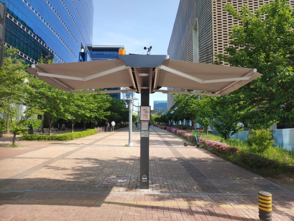 특히, 스마트 그늘막은 사물인터넷(IoT)을 접목해 기온이 15도 이상 올라가면 자동으로 펼쳐지고, 바람이 7m/s 이상 2초간 불거나 일몰 후에는 자동으로 접힌다. 날씨의 변화에 자동적으로 작동하기 때문에 행정비용이 크게 감소할 것으로 기대된다.또한 자체적으로 전력을 수급하는 태양광 패널이 상부에 설치돼 관리 비용 도 절감된다.