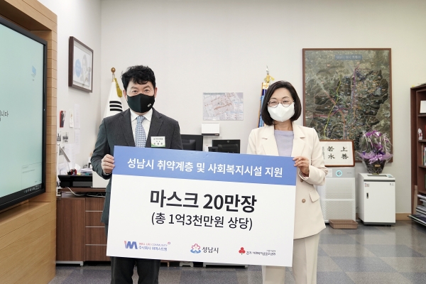 마스크를 생산·제조하는 ㈜위머스트엠이 코로나19 장기화로 힘든 시기를 보내고 있는 취약계층을 지원하고 싶다며 5월 20일 성남시에 대형 마스크 20만장을 기탁했다.시가 1억3000만원 상당이다.