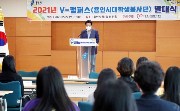 용인시 대학생 봉사단인 ‘2021년 V-캠퍼스’가 발대식을 갖고 활동을 시작했다.지난 22일 용인시청 비전홀에서 열린 발대식에는 백군기 용인시장을 비롯해 하재봉 용인시자원봉사센터장, 대학생 자원봉사자들이 참석했다.