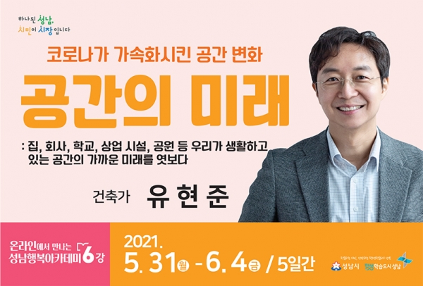 성남시(시장 은수미)는 성남행복아카데미 강연 여섯 번째 이야기로 유현준 건축가를 초청 ’코로나가 가속화 시킨 공간 변화, 공간의 미래’를 주제로 오는 5월 31일부터 6월 4일까지 5일간 유튜브 ‘성남TV’를 통해 시민들과 만나는 자리를 마련한다.