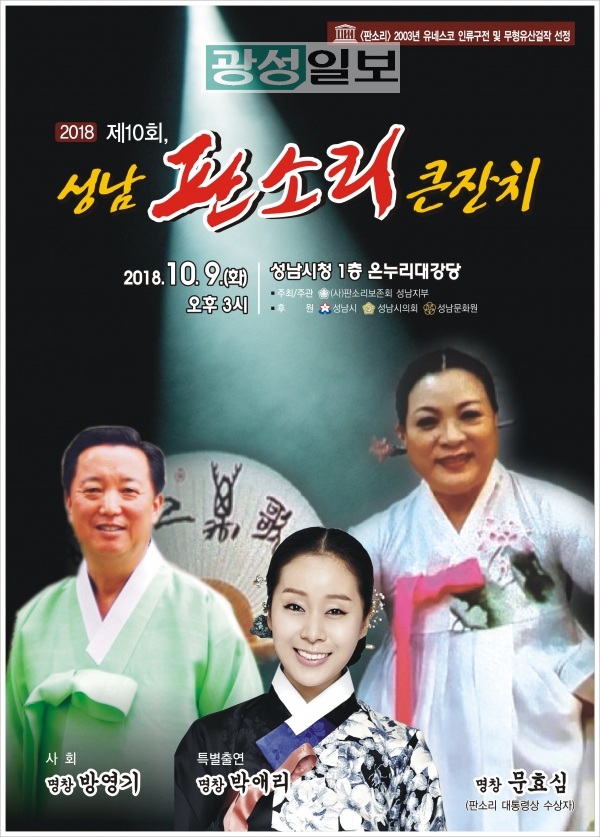 (사)한국판소리보존회 성남시지부(지회장 문효심)가 주최하고, 성남시, 성남시의회, 성남문화원이 후원하는, 제10회 ‘성남 판소리 큰잔치’ 공연이 한글날 휴일인 10. 9(화) 오후3시 성남시청 1층 온누리대강당에서 개최된다.