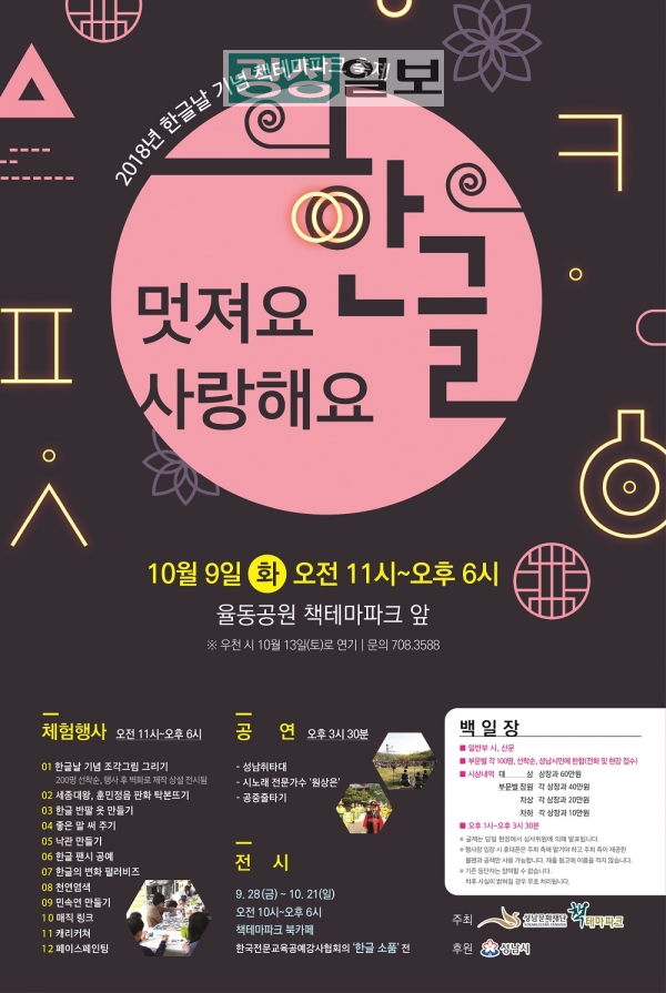 성남문화재단(이사장 은수미)이 운영하는 분당 율동공원 내 책테마파크가 올해도 한글날 기념 축제를 개최한다.<멋져요 한글, 사랑해요 한글>이란 축제로 10월 9일(화) 오전 10시부터 오후 6시까지 책테마파크 일원에서 펼쳐지는 이번 한글날 기념 축제는 백일장과 공연, 체험행사, 전시 등 시민들과 함께하는 다양한 프로그램들로 이뤄진다.