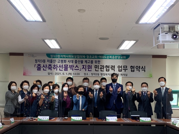 성남시 분당구 정자3동 지역사회보장협의체에서는 2021년 6월 1일(화요일) 정자3동행정복지센터 2층 회의실에서 창조교회, 여의도순복음분당교회와 ‘저출산·고령화 시대 출산율 제고를 위한 출산축하선물박스 지원 민관협력 업무협약’을 체결했다고 밝혔다.