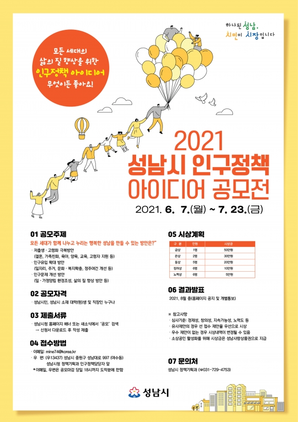 성남시(시장 은수미)는 오는 6월 7일부터 7월 23일까지 인구정책에 관한 시민 아이디어를 공모한다.공모 주제는 ‘모든 세대가 함께 나누고 누리는 행복한 성남을 만들기 위한 방안’이다.