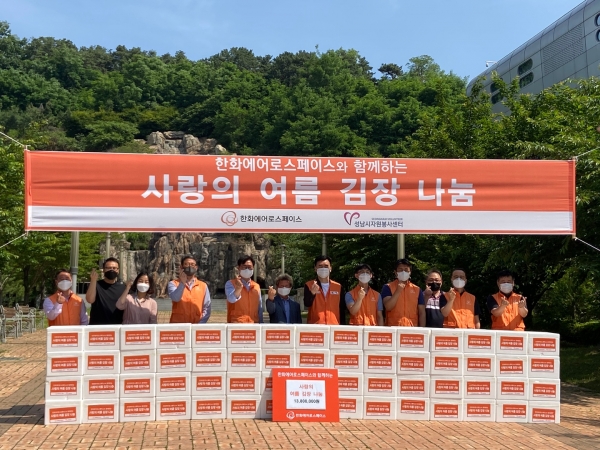 한화에어로스페이스는 코로나19로 어려움을 겪고 있는 취약계층 여름나기 김장지원을 위하여 자매마을인 원주시 귀래면 농가에서 주민들이 직접 담근 여름김장(3,000kg, 13,800,000원 상당)300박스를 구매하여 취약계층 지원활동 및 농촌경제 활성화에 기여하는 나눔 전달식을 진행했다. 전달식 진행 후, 성남시그룹홈연합회, 사회복지시설 등을 통해 김치를 전달했다.