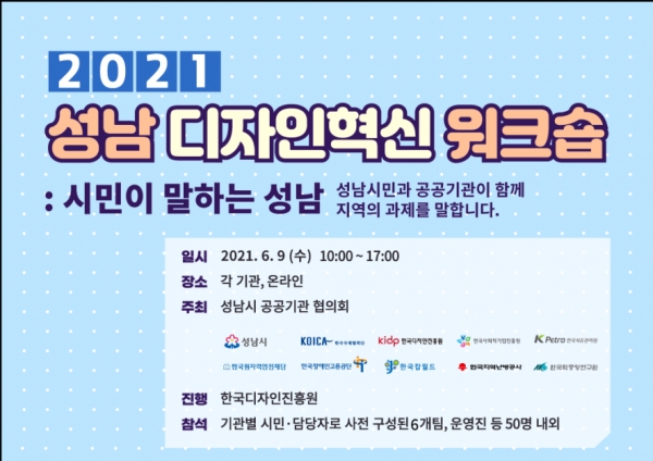 성남시 공공기관협의회(공동대표 성남시장 은수미, 한국국제협력단 이사장 손혁상, 이하 성공협)는 오는 6월 9일 시민과 함께 지역 문제 해결 방안을 모색하고자 ‘시민이 말하는 성남’이라는 부제로 「2021 성남 디자인 혁신 워크숍」을 개최한다.