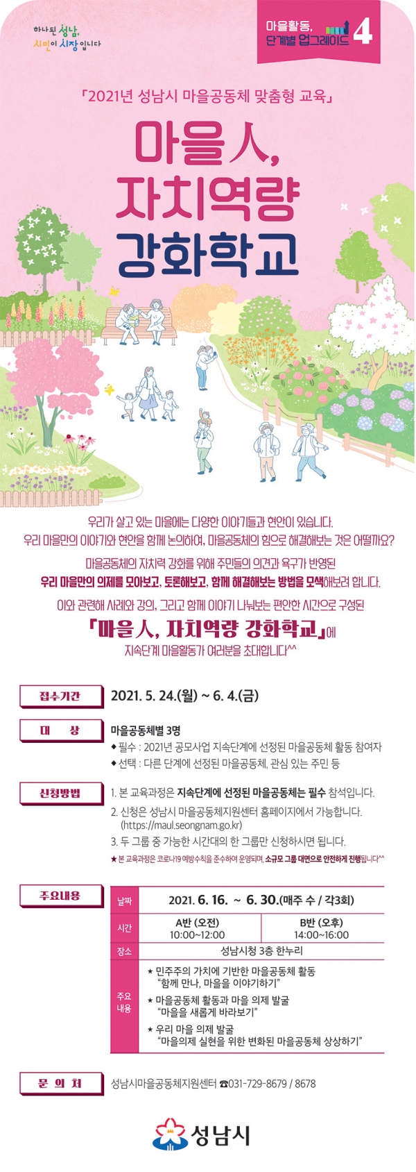 성남시(시장 은수미)는 마을공동체의 성장단계에 따라 단계별 맞춤형 교육사업을 추진하며, 이 사업의 일환으로 「성남시 마을人, 자치역량 강화학교」를 진행한다고 9일 밝혔다.