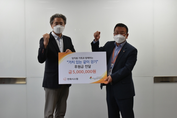 이번 후원금은 임직원 가족과 함께하는 ‘가치있는 같이 걷기’ 비대면 행사를 통하여 마련되었다. 한화시스템은 2017년부터 도촌종합사회복지관과 장애인 복지사업 지원 MOU를 체결하고 후원과 봉사를 이어오고 있다.