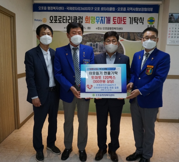 국제로타리 3600지구 오포로타리클럽 김갑진 회장 일동은 15일 오포읍 행정복지센터를 방문, ‘희망무지개’ 업무협약에 따른 토마토 120상자(300만원 상당)을 기탁했다.