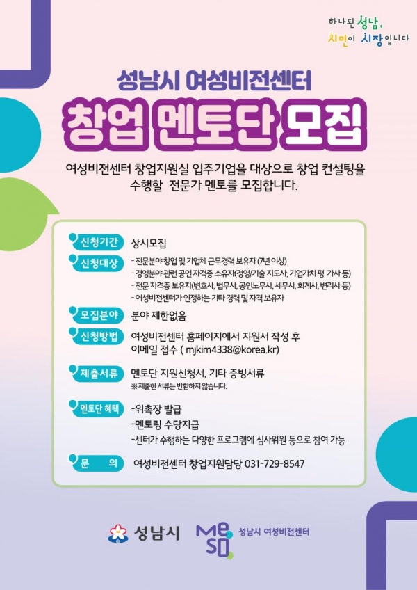 성남시 여성비전센터는 창업지원실 입주기업의 성장을 도울 전문 멘토단을 모집한다.