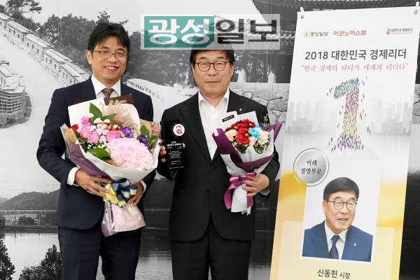 신동헌 광주시장이 10일 서울 밀레니엄 힐튼호텔에서 열린 제9회 ‘2018 대한민국 경제리더 대상’ 시상식에서 미래경영 부문 대상을 수상했다.