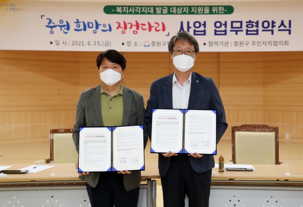중원구 주민자치협의회(회장 강창욱)와 함께 복지사각지대 발굴 지원을 위한 ‘중원 희망의 징검다리 사업 업무 협약’을 체결했다.