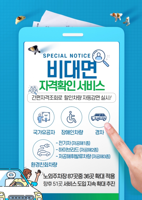 공사 윤정수 사장은 "비대면 자격확인 서비스는 코로나로부터 안심할 수 있는 비접촉 서비스로, 감면 증빙 과정을 생략해 고객에게 편의를 제공하고 대기연료 절감을 통해 공익성 실현에도 기여할 수 있다"며 "앞으로도 포스트 코로나 시대에 고객과 근무자 모두가 만족하는 공공서비스를 제공하기 위해 노력하겠다"고 밝혔다.
