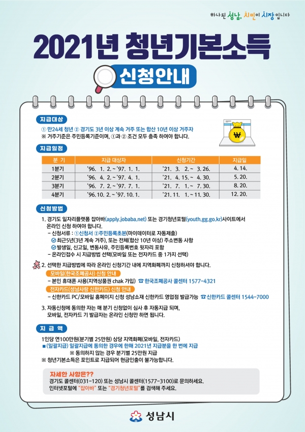 성남시 올 3분기 청년기본소득 신청받아 일괄 지급 동의하면 3·4분기 지급액 50만원 한 번에