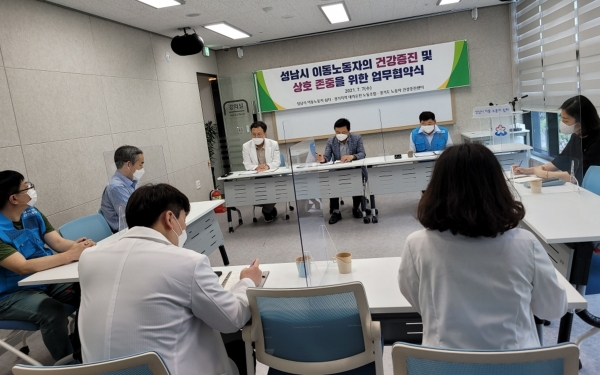 성남지역 이동노동자들이 제도권 속 건강검진을 받게 된다.성남시는 7월 7일 오후 중원구 성남동 이동노동자 쉼터에서 박인수 쉼터장, 방예원 경기도의료원 수원병원 경기도 노동자건강증진센터장, 한기석 민주노총 서비스연맹 전국대리운전 노동조합 경기지부장 등이 참석한 가운데 ‘이동노동자 건강증진을 위한 업무협약’을 했다.
