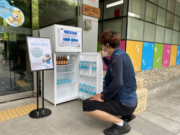 성남 도촌종합사회복지관(관장 이종민)은 찜통 더위 속에서 애쓰는 택배 노동자들이 잠시나마 더위를 식힐 수 있도록 ‘힘난다 냉장고’를 운영하여 시원한 음료수를 제공하고 있다.