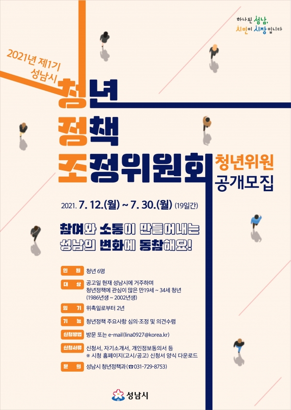 성남시(시장 은수미)는 7월 12일~30일 ‘제1기 청년정책조정위원회’에서 활동할 만 19~34세 청년위원 6명을 공개 모집한다.