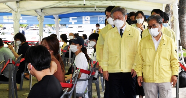 이재정 경기도교육감이 19일 오전 이재명 경기도지사와 함께 수원시 장안구 코로나19 백신 예방접종센터를 방문해 고등학교 3학년 학생들과 교직원 백신 접종 현장을 살폈다.