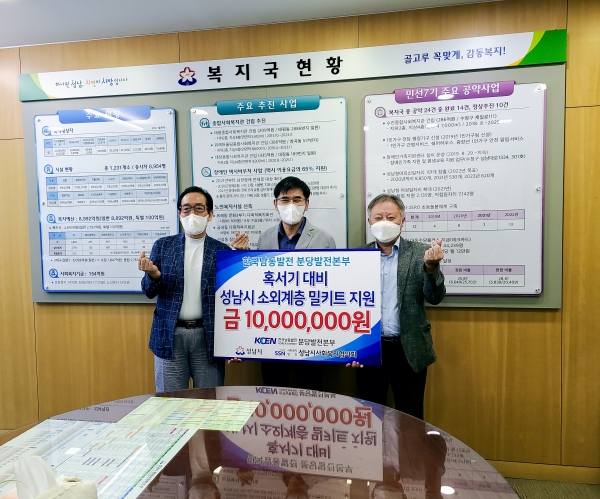 시는 이날 오후 2시 시청 5층 복지국장실에서 정인목 성남시 복지국장과 장용창 한국남동발전 분당발전본부장, 노만호 성남시사회복지협의회장 등이 참석한 가운데 ‘혹서기 대비 성남시 소외계층 밀키트 전달식’을 했다.밀키트는 햇반, 김, 죽, 참치, 라면 등 12개 먹거리가 한 세트(세트당 5만원)로 구성된 식사 꾸러미다.