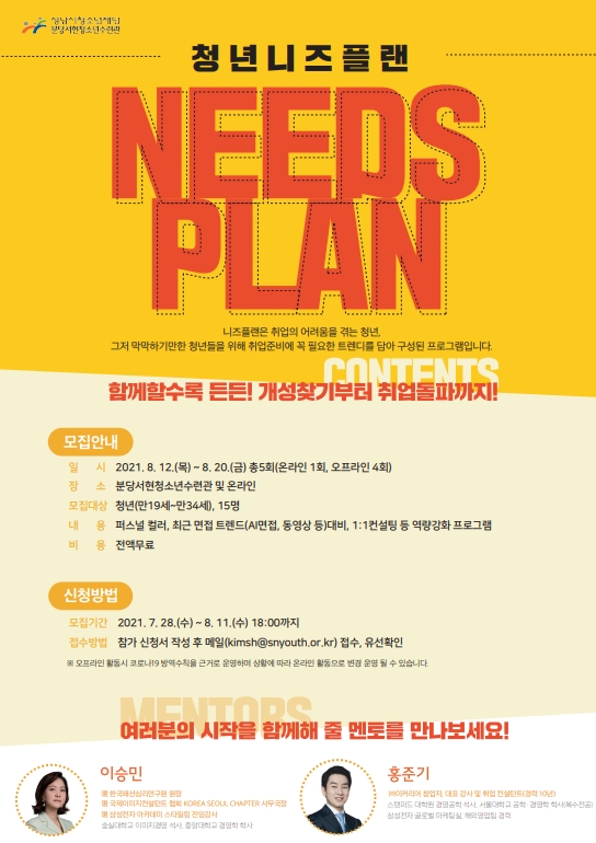 성남시청소년재단(대표이사 진미석) 분당서현청소년수련관은 청년 역량 강화를 위한 사업의 일환으로 취업 준비생들을 위한‘청년 Needs Plan’ 참가자를 오는 8월 11일(수)까지 모집한다.