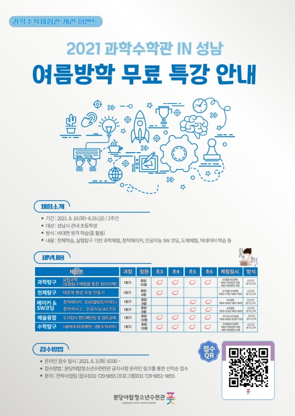 한편, 이번 여름방학 특강은 과학수학체험관 개관기념 이벤트로 진행되며 8월 3일부터 온라인 접수가 가능하다. 더 자세한 내용은 분당야탑청소년수련관 홈페이지를 통해 알 수 있다.