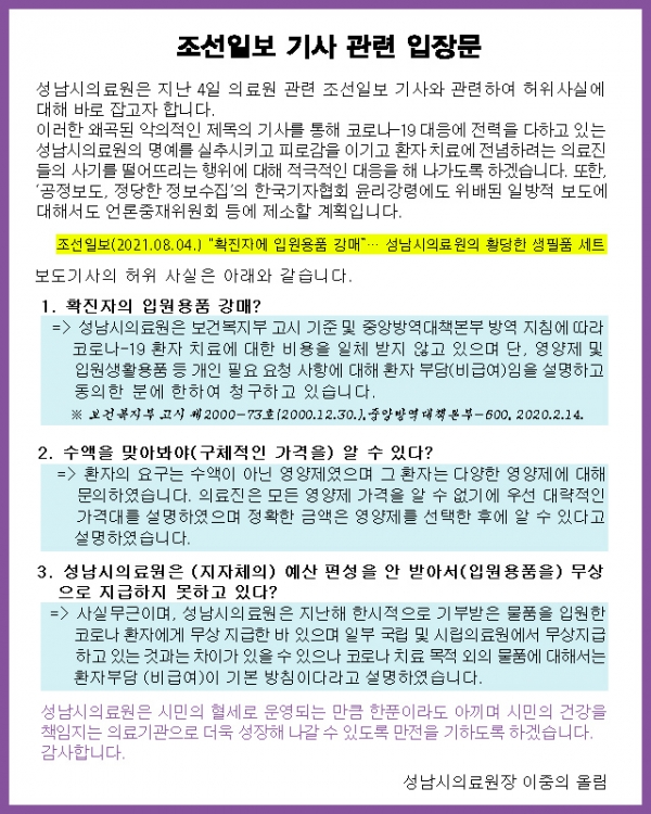 조선일보 측의 ‘“확진자에 입원용품 강매”… 성남시의료원의 황당한 생필품 세트’ 기사에 언급된 허위사실과 관련하여 반박 입장문을 성남시의료원 홈페이지(wwww.scmc.kr)에 게시하였다.