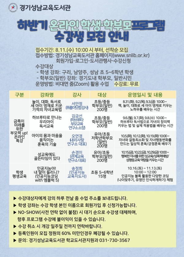 수강신청은 11일부터 경기성남교육도서관 홈페이지(www.snlib.or.kr) 회원가입 뒤 ‘도서관행사’란에서 하면 된다. 프로그램 관련 문의는 경기성남교육도서관 학교도서관지원과(031-730-3567)로 문의하면 된다.