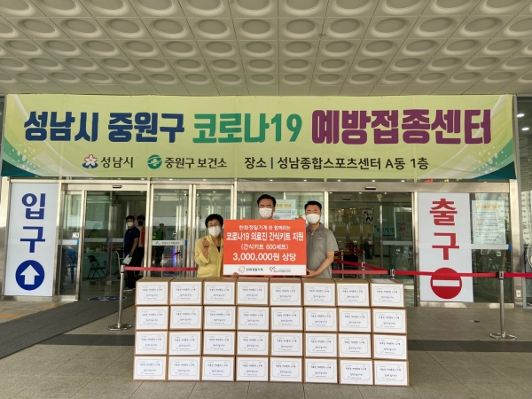 성남시자원봉사센터(센터장 이덕은)는 11일 오후 3시 중원구 코로나19예방접종센터에서 ‘한화정밀기계와 함께하는 코로나19 의료진 간식키트 지원 전달식을 진행하였다.