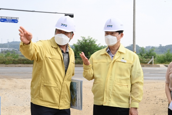 이어 이한규 부지사는 장기간 지속되는 폭염 및 코로나19를 대비, 건설 노동자들의 근무환경 실태 등을 점검하고자 화성시 마도면 소재 에코팜랜드 조성사업 공사현장을 방문했다.