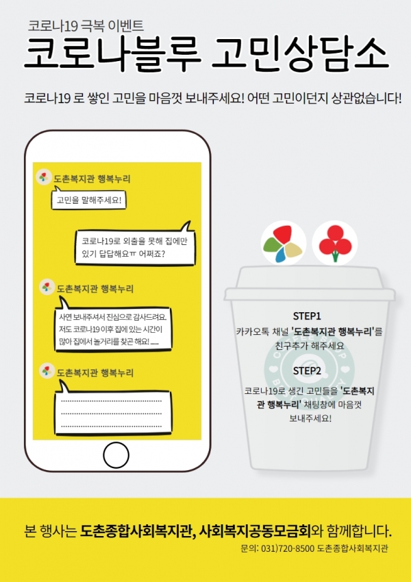 성남시 중원구 도촌동에 위치한 도촌종합사회복지관(관장 이종민)은 8월 11일(수) 부터 지역사회 코로나블루 해소를 위한 온라인 고민상담소 토닥온(ON)을 진행했다.