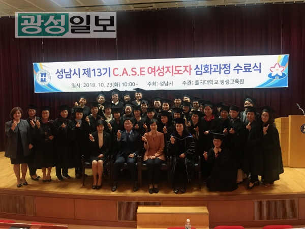 성남시(시장 은수미)는 10월 23일 오전 10시 수정구 양지동 을지대학교 을지관 8층 밀레니엄홀에서 ‘13기 성남시 여성지도자 심화과정 수료식’을 열었다.이날 40명이 학사모를 썼다.