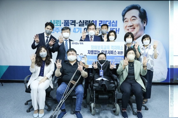 이낙연 더불어민주당 대선 경선 예비후보는 20일 오후 서울 여의도에 있는 선거캠프 회의실에서 장애영유아보육교육정상화추진연대(대표 김영란)와 정책협약식을 갖고 장애영유아에 대한 보육 및 교육에 대한 차별 해소와 의무교육 보장을 위해 적극 나서겠다고 밝혔다.