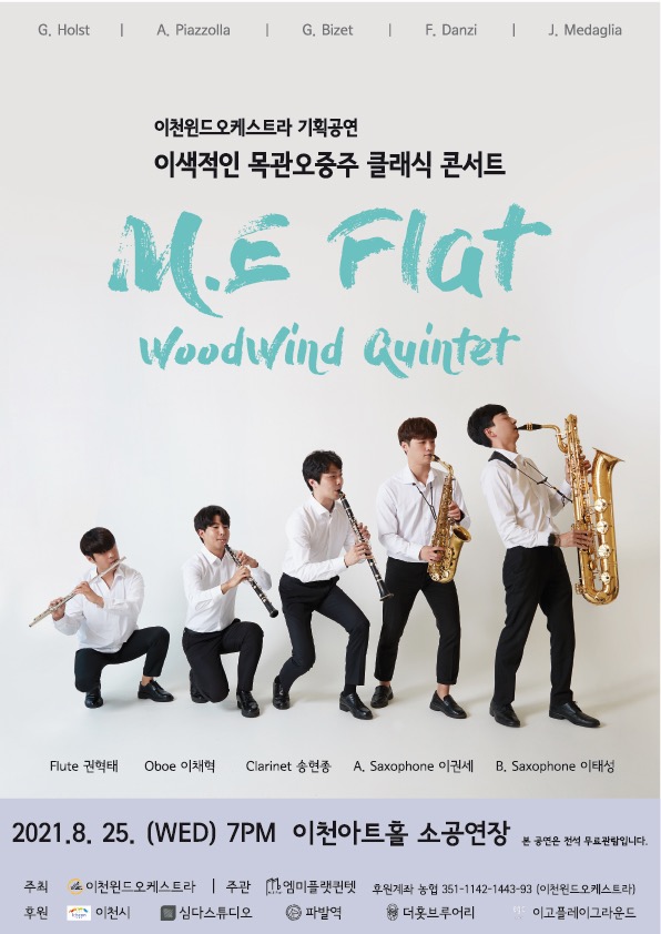 이천윈드오케스트라는 2020년 1월 이천 청년 관악기 연주자 40여명으로 창단하여 현재 80여명에 이르는 단원들과 함께하는 공동체로, 코로나19 확산에 따라 ‘엠미플랫퀸텟(M.E Flat Woodwind Quintet)’이라는 목관오중주 유닛으로 활동을 펼치고 있다.